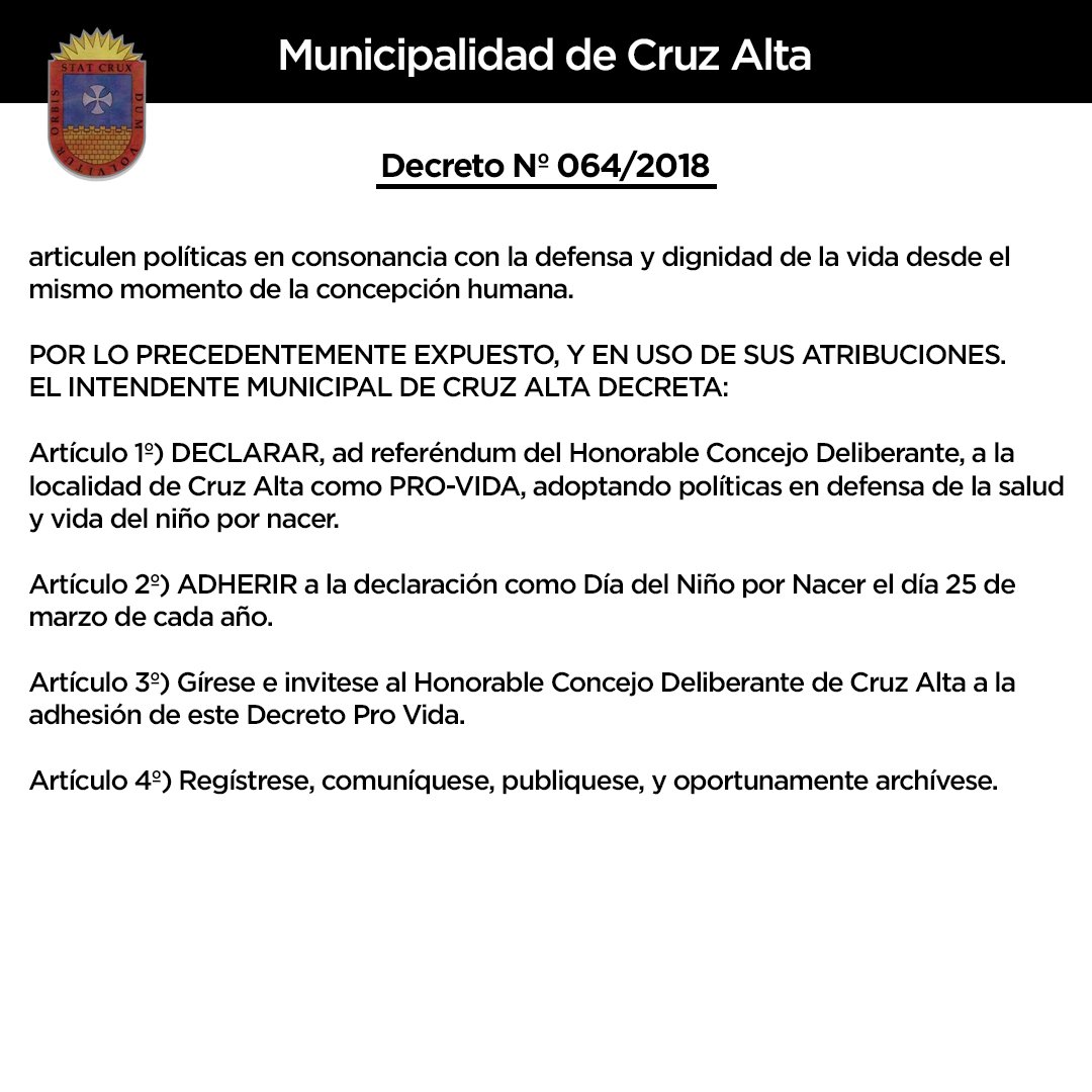 El decreto Nº 064/2018 implica la aplicación de políticas activas municipales en defensa de la salud y la vida del niño por nacer en todos los casos. Para defender lo explicado citó la Constitución Nacional y Provincial y fundamentos científicos que defienden al niño desde la concepción.