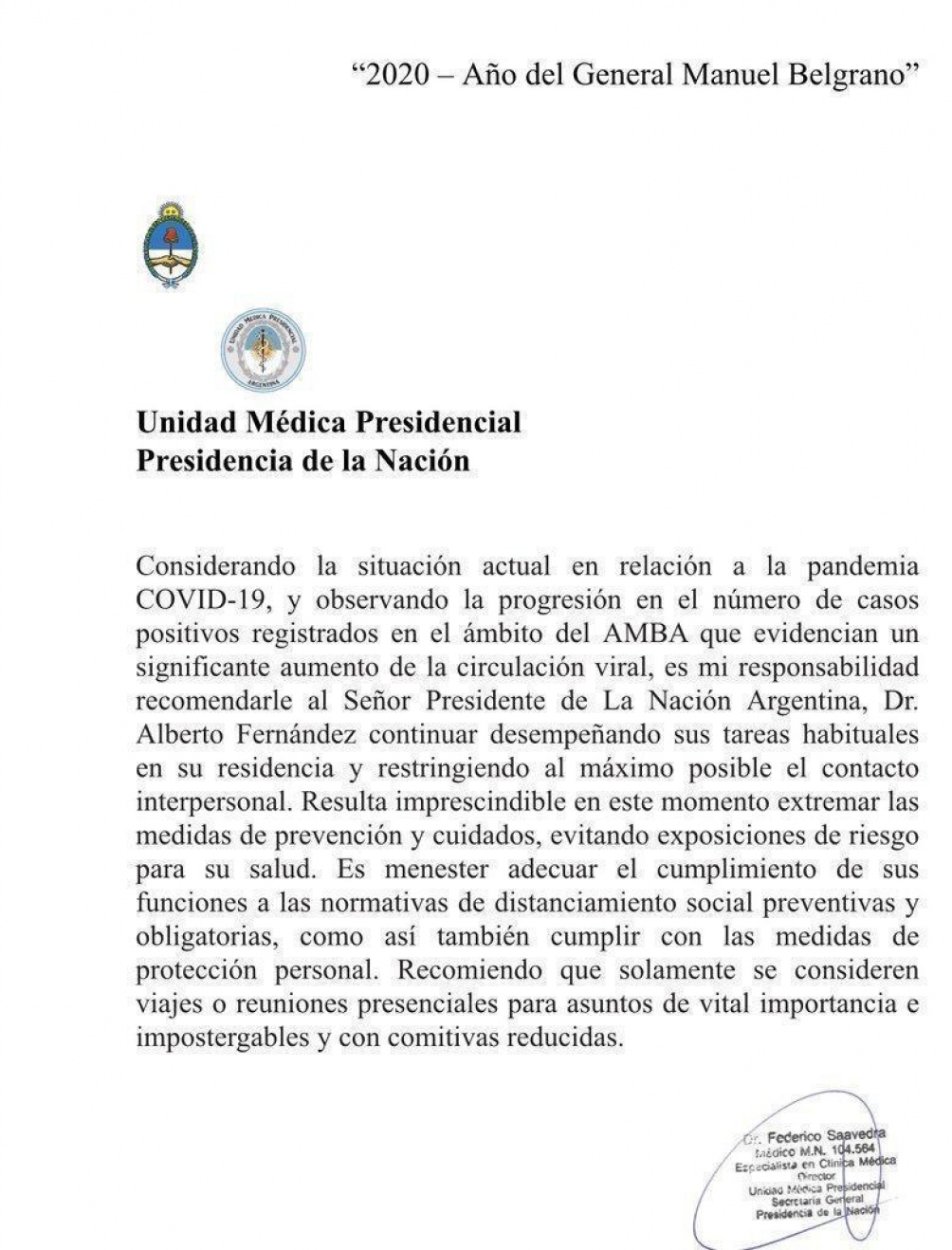 «Considerando la situación actual en relación a la pandemia Covid-19 y observando la progresión en el número de casos positivos registrados en el ámbito del AMBA, que evidencian un significante aumento de la circulación viral, es mi responsabilidad recomendarle al Presidente Alberto Fernández continuar desempeñando sus tareas habituales en su residencia y restringiendo al máximo posible el contacto interpersonal», dice una nota firmada por Federico Saavedra, de la Unidad Médica Presidencial.