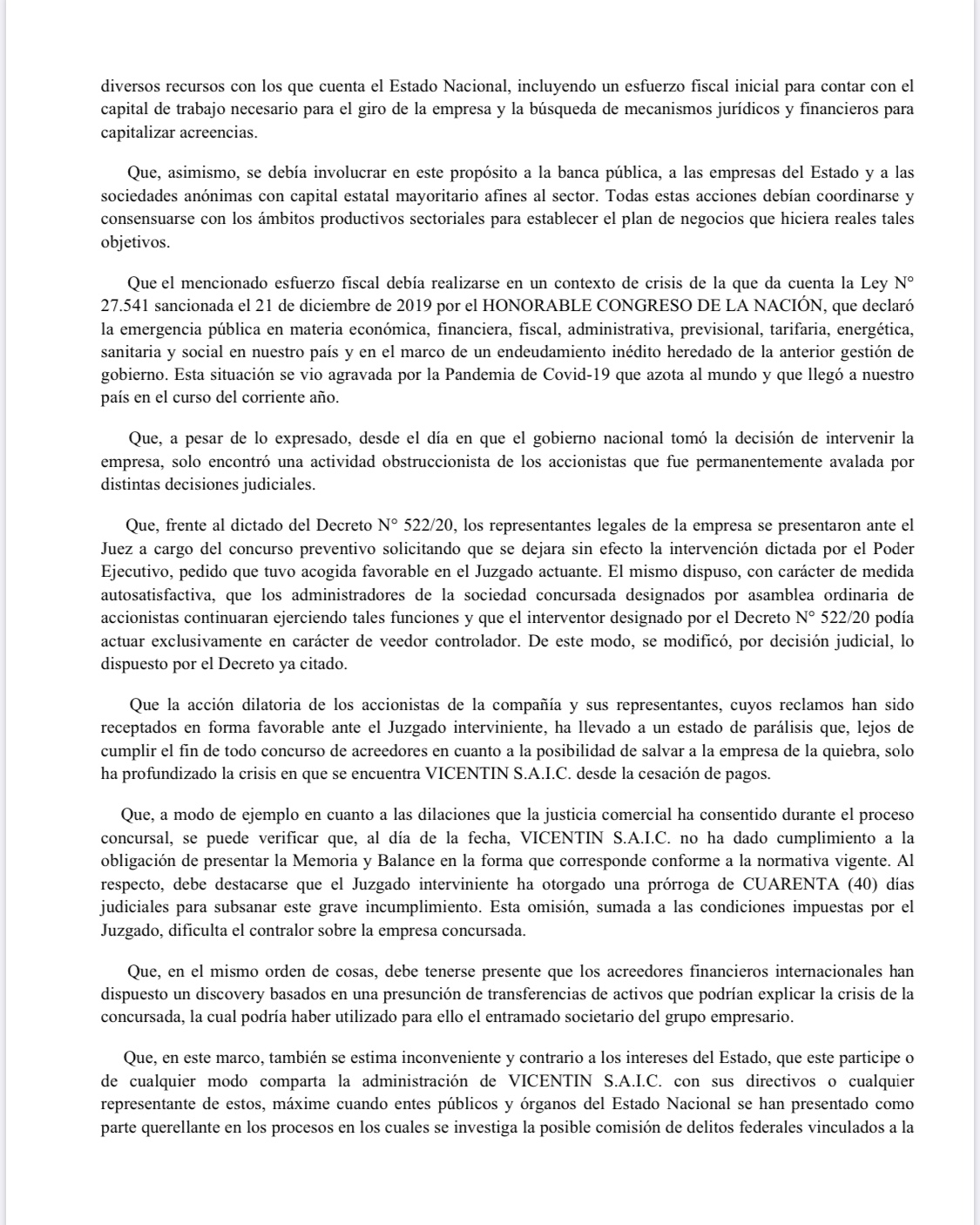 Y agregó: «Nuestra obligación es que se investiguen las maniobras que provocaron el estado de falencia en el que la empresa ha caído. La intervención por 60 días era fundamental antes de declarar a Vicentin S.A.I.C. como un bien de utilidad pública, para conocer su verdadero estado patrimonial».