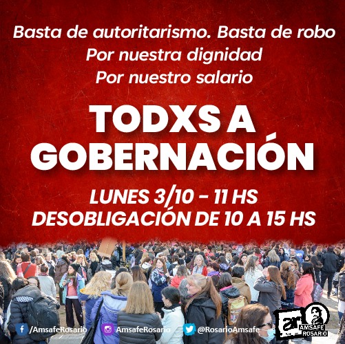Tras conocerse la liquidación de los sueldos de los docentes públicos santafesinos, con los anunciados descuentos por los días de paros llevados adelante por Amsafé durante septiembre, desde el gremio salieron rápidamente al cruce y convocaron una masiva manifestación. Será este lunes en la sede local de Gobernación (Santa Fe 1946), a las 11, y entre las 10 y las 15 habrá desobligación de alumnos.