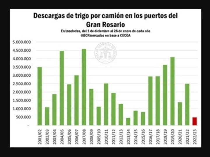 Según informó la Bolsa de Comercio de Rosario (BCR), hasta el 26 de enero apenas se habían entregado 484.440 toneladas por camión, esto es un 83% por debajo del promedio de los últimos cinco años. En tanto, se trata del menor volumen desde el año 2013 y el segundo más bajo desde el inicio de los registros en el año 2001.