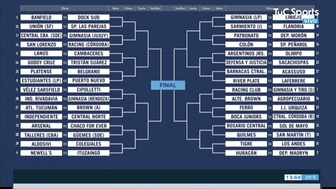 La modalidad del sorteo tuvo a 32 cabezas de serie, los 28 equipos de primera división incluidos los recientemente ascendidos Tigre y Barracas Central, más los cuatro equipos de la Primera Nacional que disputaron por el ascenso en las instancias finales: Quilmes, Ferro, Almirante Brown e Independiente Rivadavia.