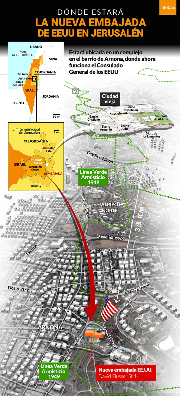 El edificio que oficiará de embajada es, desde 2010, el Consulado General de los EEUU en Israel y las autoridades norteamericanas explican que esa locación nunca estuvo en manos jordanas, más allá de que se encuentre sobre la línea verde.