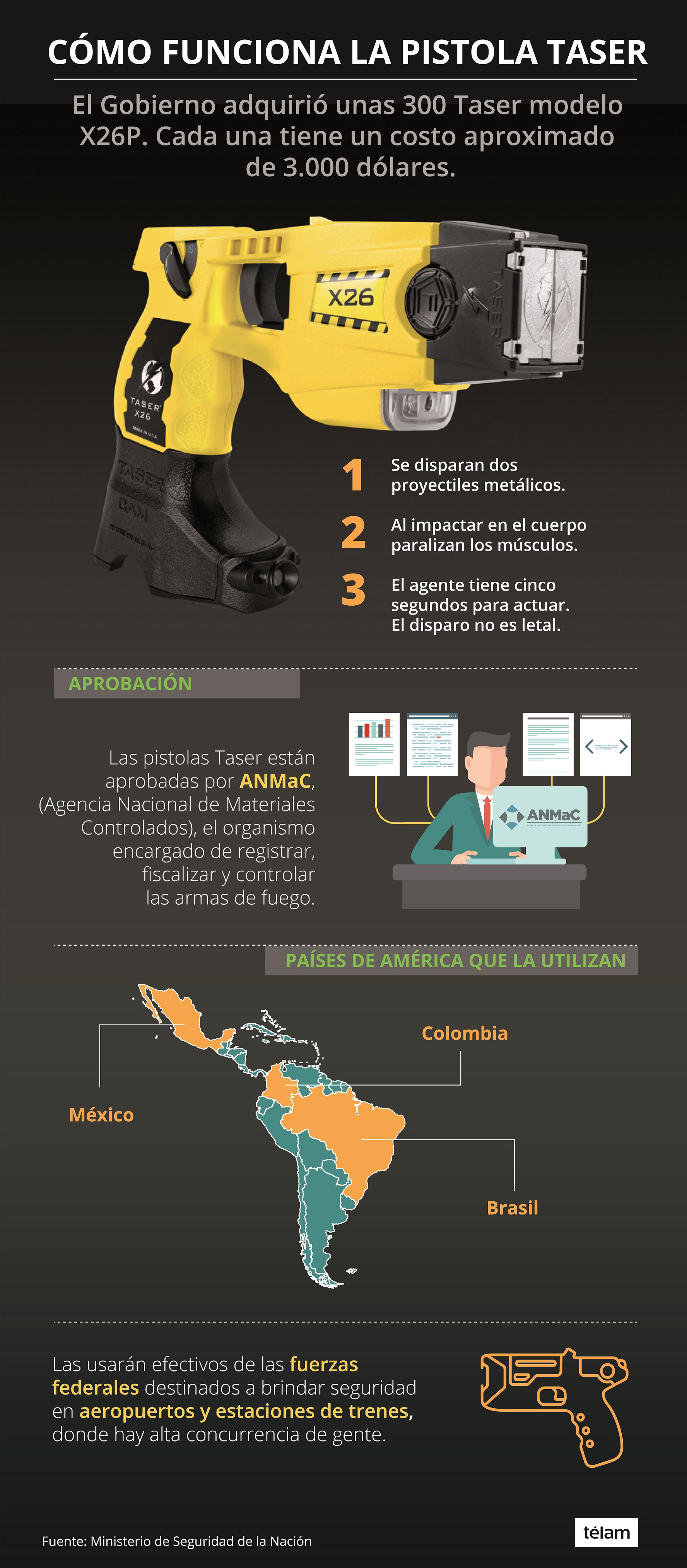 El modelo que adquirió el Gobierno es el X26P, un dispositivo de transmisión de impulsos eléctricos de muy bajo amperaje. Según trascendió, el Ministerio de Seguridad ya dispone de un cargamento de 300 unidades. Cada pistola tiene un costo aproximado de 3.000 dólares.