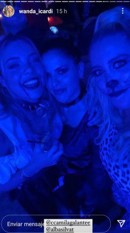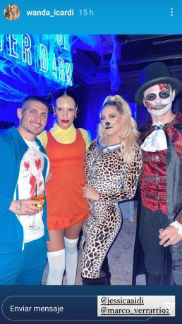 Después, Wanda compartió una foto en la que se los ve junto a Marco Verrattti, compañero de club de Mauro, y su pareja, Jessica Aidi. Otra en la que varios jóvenes difíciles de identificar por las caracterizaciones acompañan a Icardi. Y otras en las que se la puede ver a ella riéndose con otras muchachas, como Camila Galante, la esposa de Leandro Paredes, y Alba Silva, la novia de Sergio Rico.