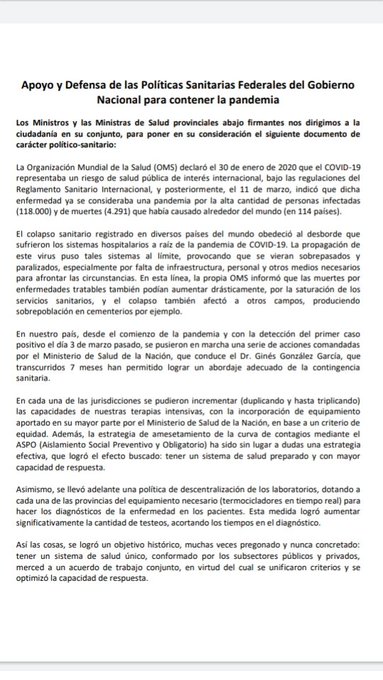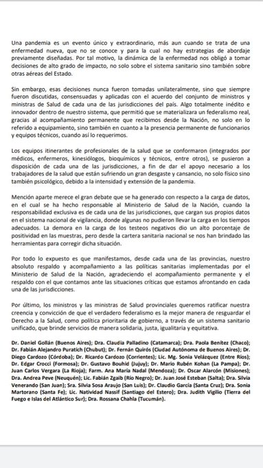 «Las decisiones que se han tomado en todo este tiempo nunca fueron de manera unilateral, sino que siempre fueron discutidas, consensuadas y aplicadas con el acuerdo del conjunto de ministros y ministras de Salud de cada una de las jurisdicciones del país. Algo totalmente inédito e innovador dentro de nuestro sistema, que permitió que se materializara un federalismo real, gracias al acompañamiento permanente que recibimos de la Nación, no solo en lo referido a equipamiento, sino también en cuanto a la presencia permanente de funcionarios y equipos técnicos, cuando así lo requerimos», reza uno de los párrafos.