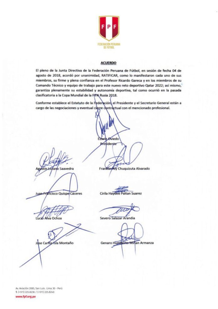 “Mañana mismo podría estar firmando la renovación y acordamos respetar todo el proceso”, agregó Lozano, luego de que la Junta Directiva de la Federación Peruana de Fútbol anunciara oficialmente su decisión “unánime” de “ratificar su firme y plena confianza” en el técnico argentino.