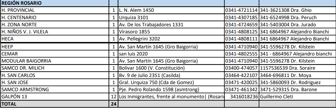 De las 50 unidades, 24 están en Rosario, distribuidos en los principales centro de salud y en uno de los galpones frente al Monumento. Los restantes se ubican de la siguiente manera: 13 en Santa Fe, 5 en Venado Tuerto y 4 en Reconquista y Rafaela.