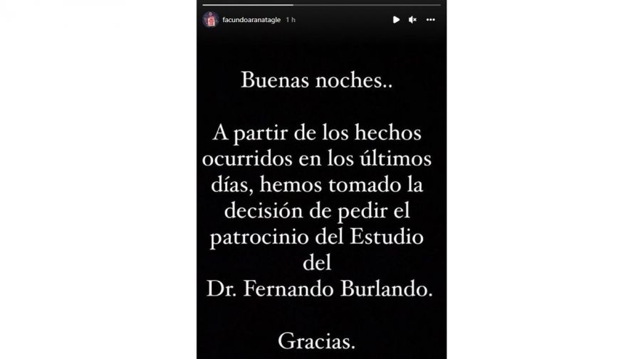 «Buenas noches. A partir de los hechos ocurridos en los últimos días, hemos tomado la decisión de pedir el patrocinio del Dr. Fernando Burlando. Gracias», escribió Facundo Arana, apenas un par de horas después de que su esposa, la modelo María Susini, liderara una feroz defensa donde aseguró que el actor «es la víctima» y que «él no es una persona violenta». Aunque aclaró que a veces puede golpear la mesa si está enojado.