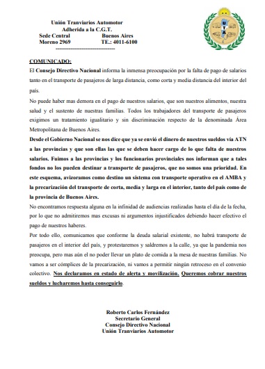 Desdela Unión Tranviarios Argentinos (UTA) Nacional enviaron un comunicado a UTA Rosario: