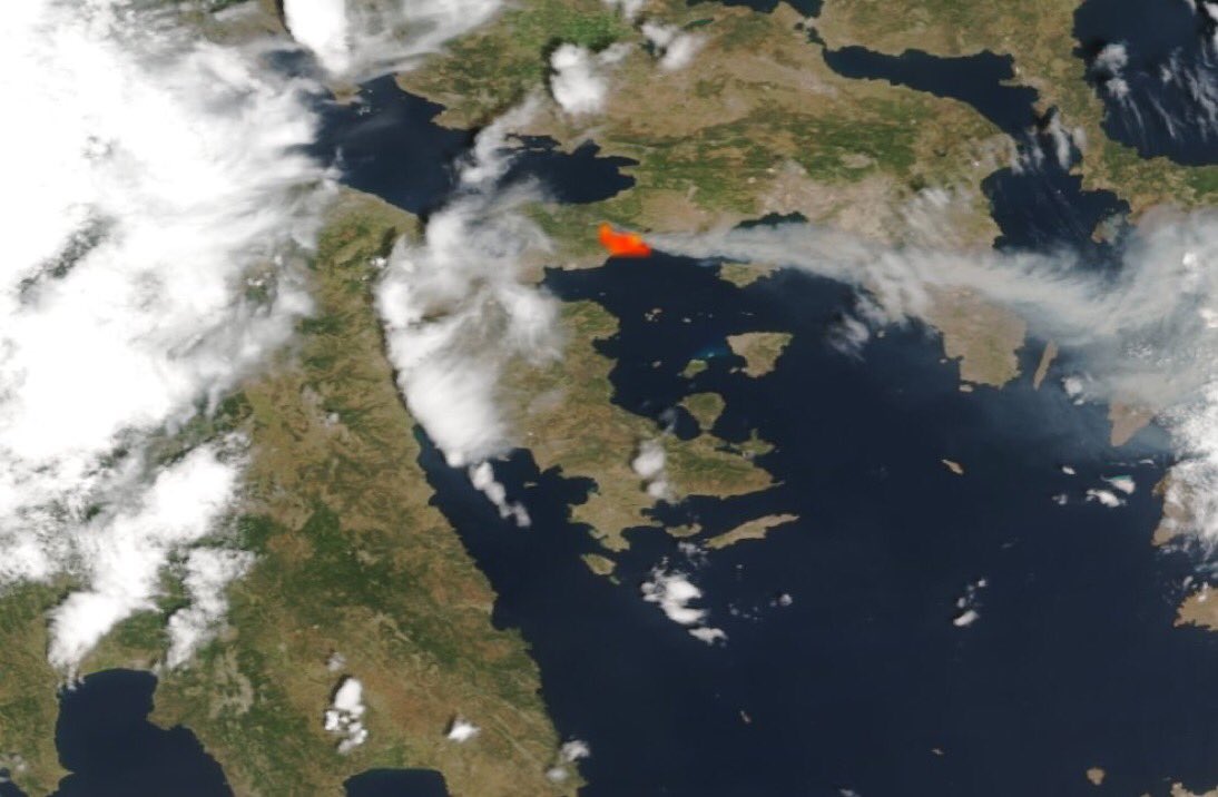 La NASA difundió imágenes capturadas el 24 de julio de 2018. Las áreas que se queman activamente (puntos calientes) están delineadas en rojo.