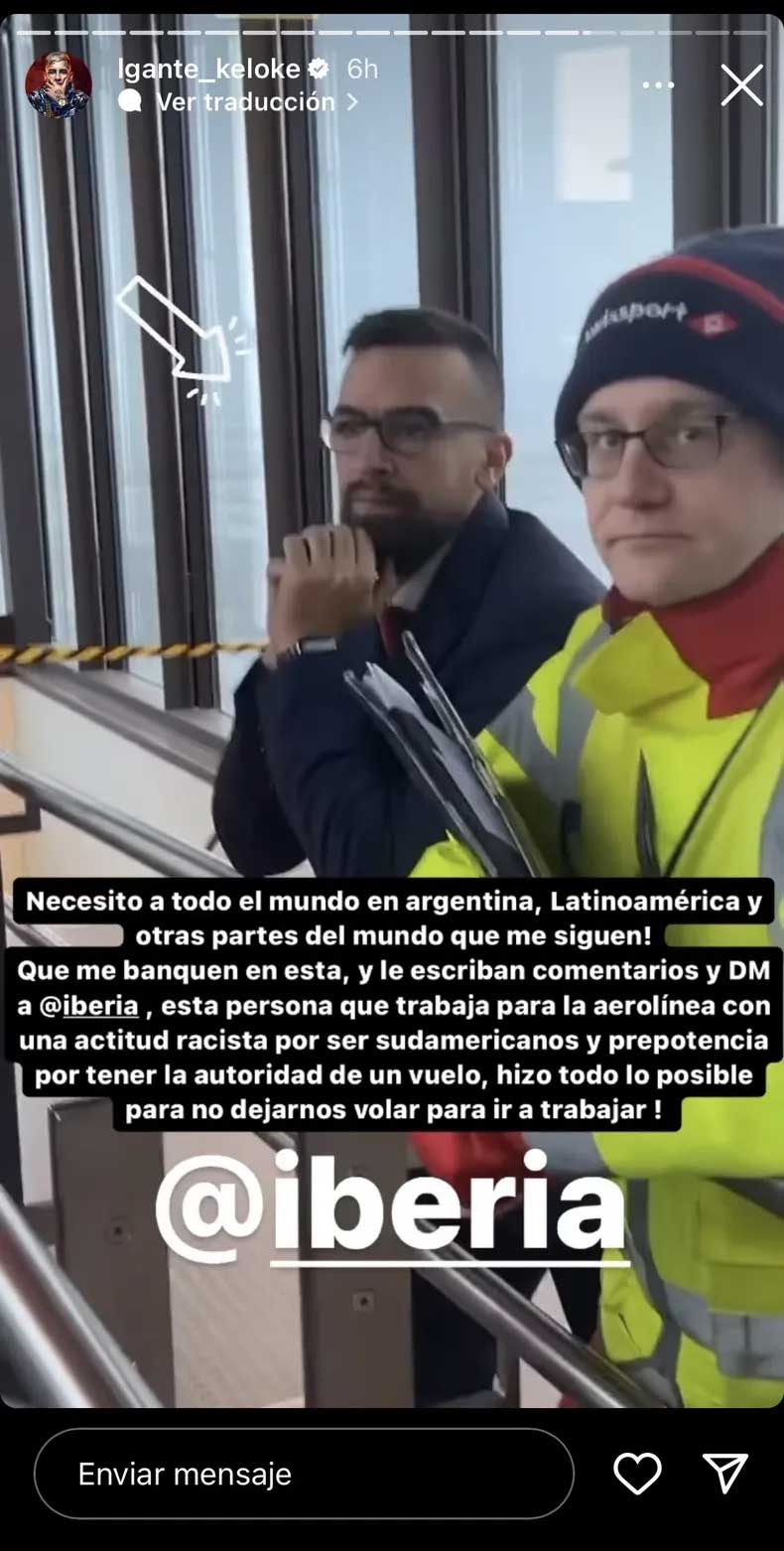 Tras publicar la imagen del trabajador de la aerolínea, el artista señaló: “Esta persona trabaja con una actitud racista, por ser sudamericanos. Y con prepotencia, porque tiene la autoridad del vuelo. Ese hombre es quien nos hizo perder el vuelo».