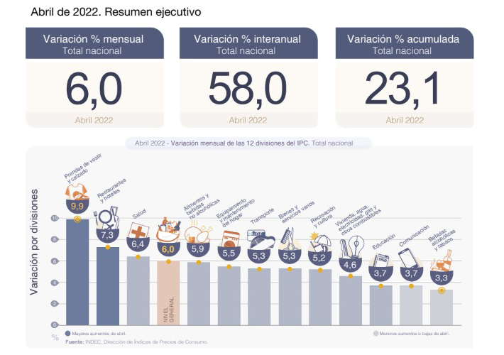 “El Nivel general del Índice de precios al consumidor (IPC) aumentó 6,0% mensual en abril de 2022, y acumuló en el primer cuatrimestre del año una variación de 23,1%. En la comparación interanual registró un incremento de 58,0%”, informó el Indec.