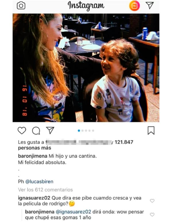 Acostumbrada a hablar sin filtro, Jimena Barón revolucionó las redes sociales al responder un comentario de un usuario en Instagram. La actriz publicó una foto junto a Morrison, su hijo de cuatro años, fruto de su relación con Daniel Osvaldo. «Mi hijo y una cantina. Mi felicidad absoluta», destacó junto a la imagen.