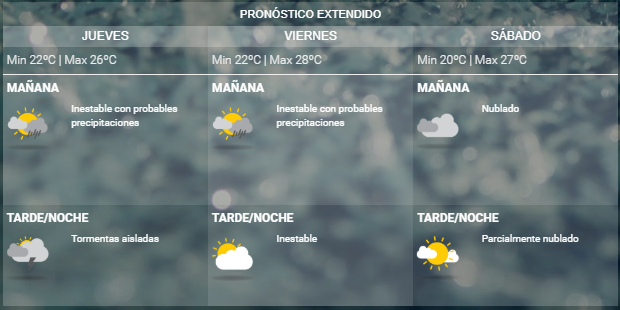 La entidad pronostica lluvias y tormentas tanto para el jueves como para el viernes, con máximas que alcanzarán los 26 y 28 grados respectivamente. El sábado volvería a secarse el ambiente, con una jornada que se espera que sea parcialmente nublada y tenga una máxima de 27 grados.