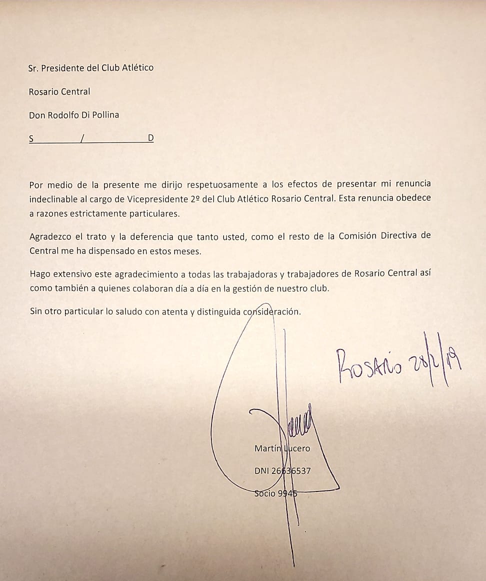 El vicepresidente segundo de Rosario Central, Martín Lucero, presentó este jueves por la tarde la renuncia de forma indeclinable en comisión directiva luego de la salida de Edgardo Bauza como entrenador del primer equipo.