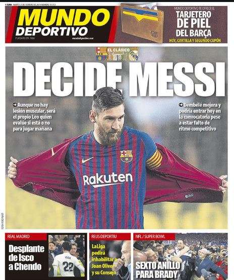 «Aunque no hay lesión muscular, será el propio Leo quien evalúe si está o no para jugar», publica el periódico español en su tapa, en la que además pone en duda a Ousmane Dembélé, quien «podría entrar en la convocatoria pese a estar falto de ritmo competitivo».