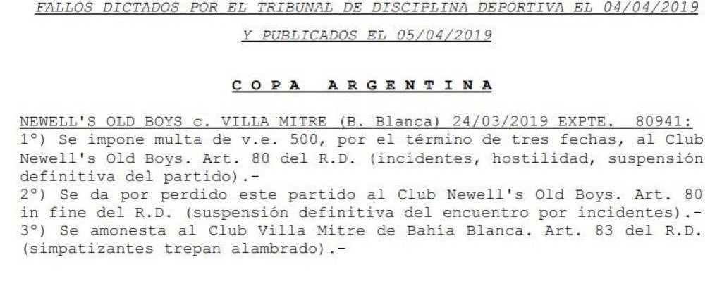 Los episodios ocurrido el pasado 24 de marzo en la ciudad de Santa Fe, en la que la parcialidad de Newell’s provocó serios incidentes en el encuentro ante Villa Mitre de Bahía Blanca por Copa Argentina terminó saliendo caro la para institución del Parque Independencia.