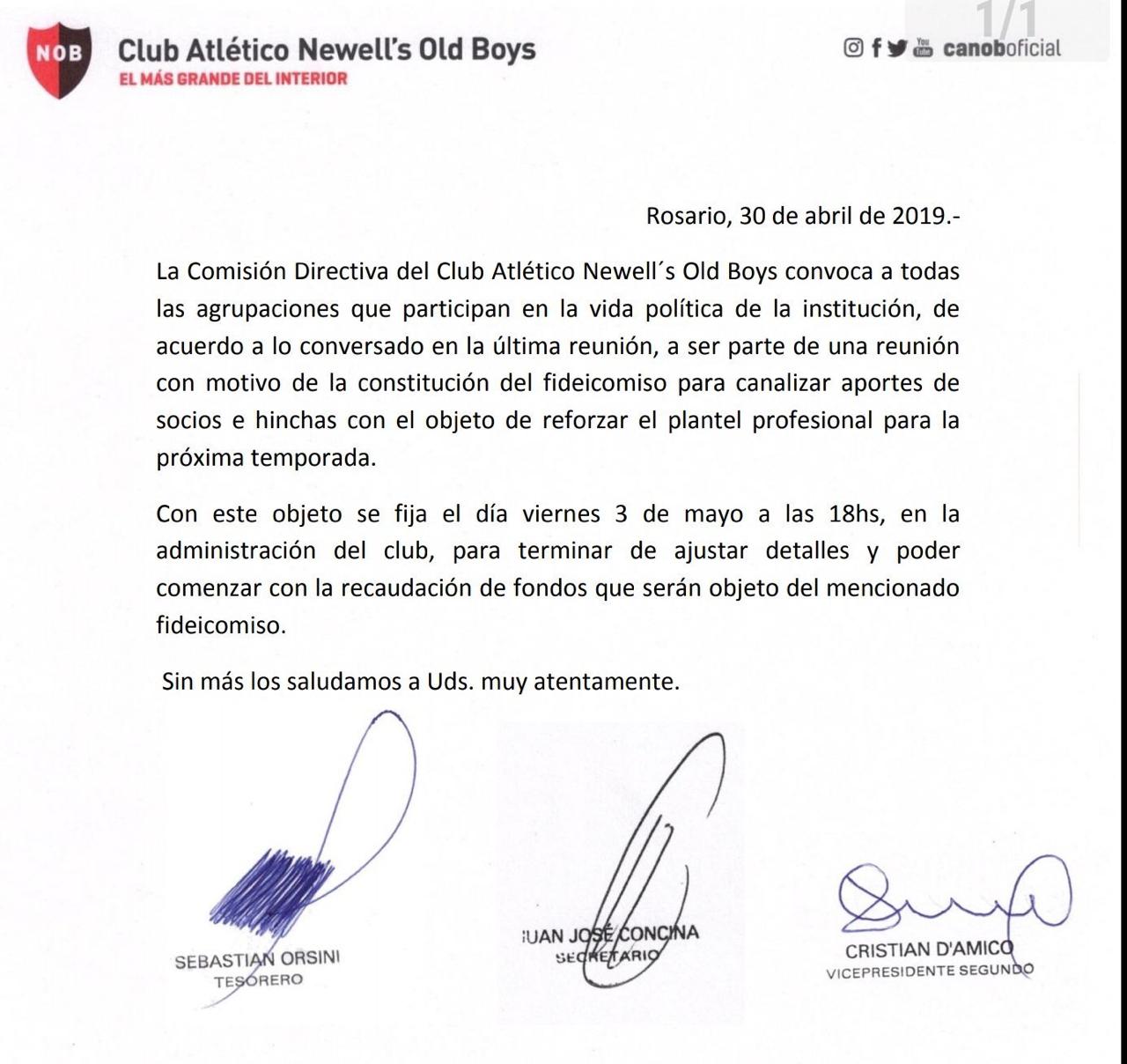 La comisión directiva de Newell’s dio a conocer este martes una notificación donde convoca a las distintas agrupaciones opositoras que forman parte de la vida política del club, a participar de una reunión que se llevará a cabo el próximo viernes 3 de mayo.