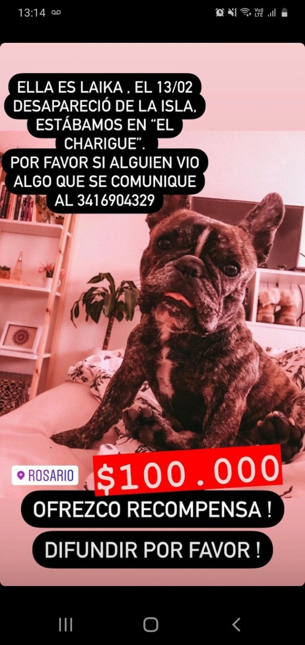 Una familia rosarina ofrece 100 mil pesos de recompensa para ubicar a Laika, una perra Bulldog Francés desaparecida el pasado 13 de febrero. Fue perdida de vista ese día en horas de la tarde, cuando se encontraban en la zona de islas, más precisamente en el lugar conocido como «El Charigüe».