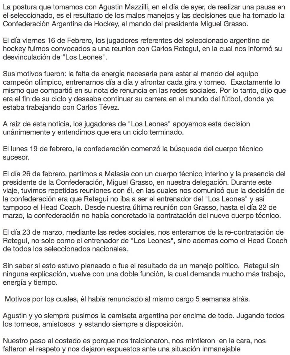 Esta tarde, realizó otra publicación donde cuenta en extensión los hechos que lo llevaron a renunciar al seleccionado, y están relacionados a la renuncia y re-contratación de Carlos Retegui, quien había dicho que no tenía más fuerzas para continuar al cargo del equipo.