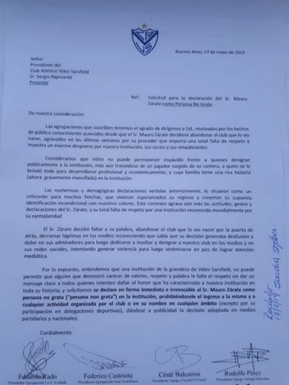 Una carta firmada por las agrupaciones que no se encuentran en la actual conducción, la Amalfitani, el Círculo El Fortín, la V Azulada y la Unidad Velezana, insta a la Comisión Directiva encabezada por Sergio Rapisarda a impedirle al actual futbolista xeneize volver a pisar la institución durante toda su vida, excepto como parte de una delegación visitante