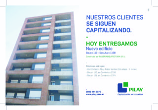 Este lunes 21 de octubre Pilay inaugurará el Bauen 119. El edificio, ubicado en el microcentro de la ciudad, en calle San Juan 1168, está compuesto por 30 unidades, 10 departamentos de 1 dormitorio y 20 departamentos de 2 dormitorios.