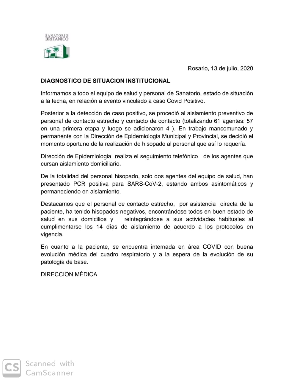Las luces de alarma se habían encendido en el Británico semanas atrás, cuando paciente de Villa Constitución que había ingresado al lugar para una operación de urgencia dio positivo de coronavirus. A raíz de ese suceso, 61 personas quedaron aisladas para evitar la propagación del coronavirus.