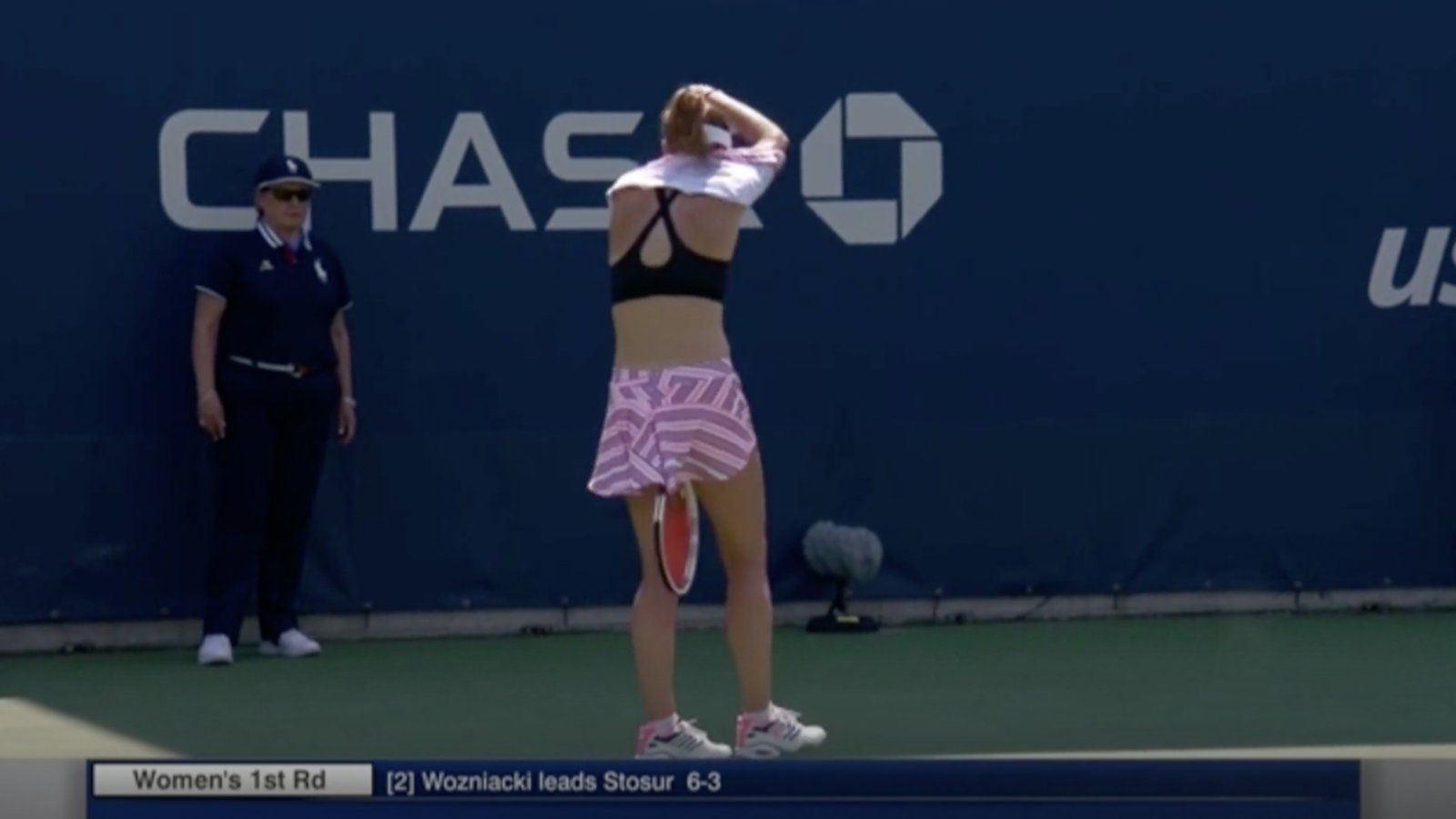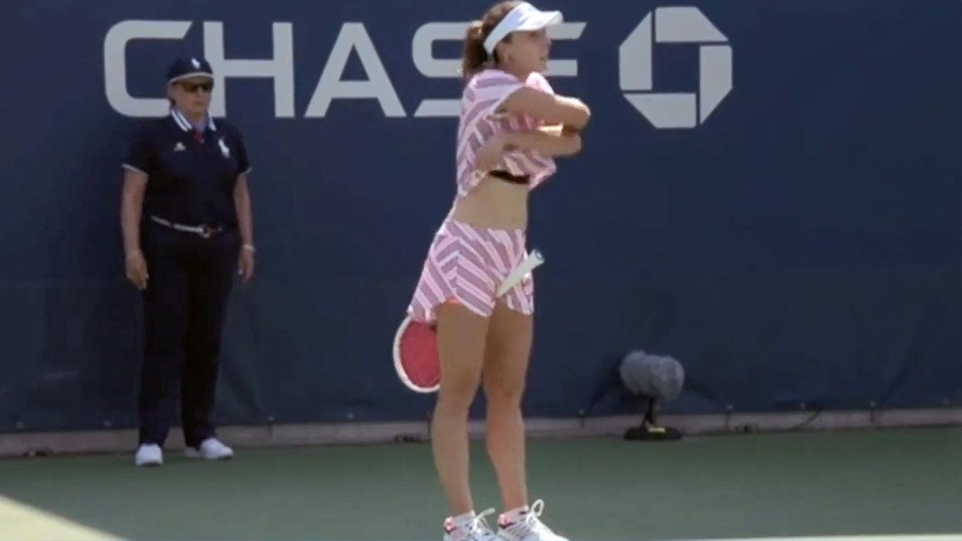 La francesa, ubicada en el puesto 31 del ranking, protestó por la sanción, pero el umpire se mantuvo en su fallo y explicó que el reglamento no le permitía quitarse la camiseta en el medio de la pista.