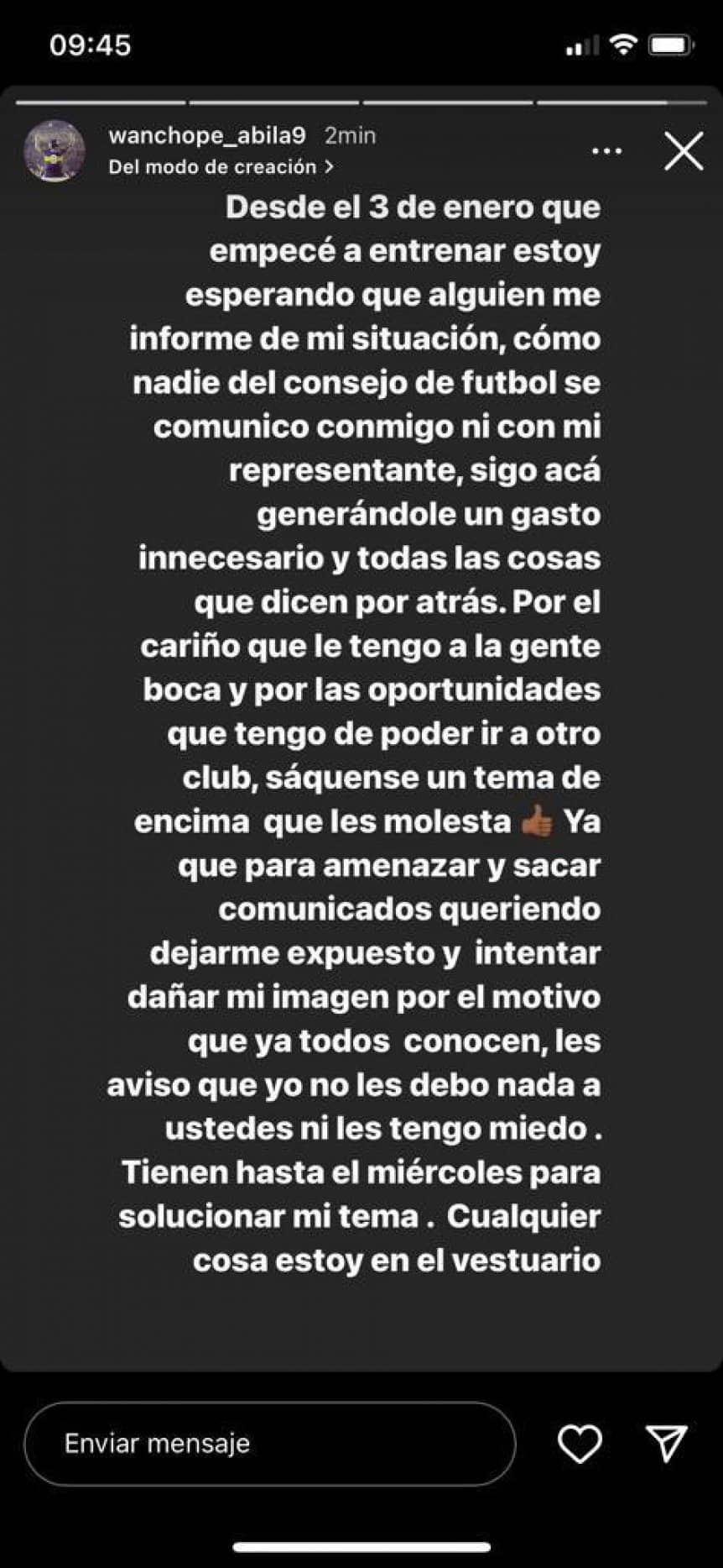 «Desde el 3 de enero que empecé a entrenar esperando que alguien me informe de mi situación, como nadie del Consejo de Fútbol se comunicó conmigo, ni con mi representante, sigo acá, generándole un gasto innecesario y todas las cosas que dicen por atrás», comenzó Ábila su posteo en una historia de Instagram.