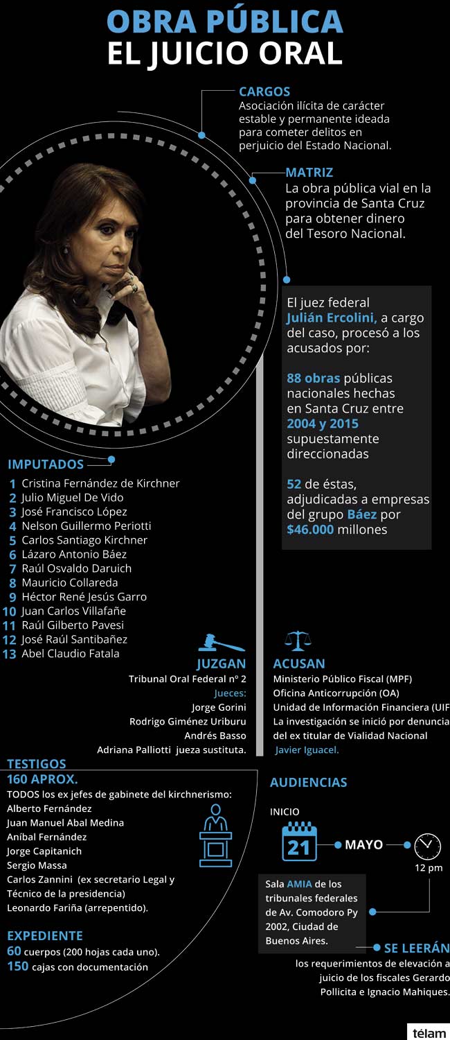 Este primer juicio que se le seguirá, junto a otros doce acusados, se relaciona con la adjudicación de 51 obras públicas a empresas vinculadas al detenido Báez durante el kirchnerismo, en Santa Cruz.
