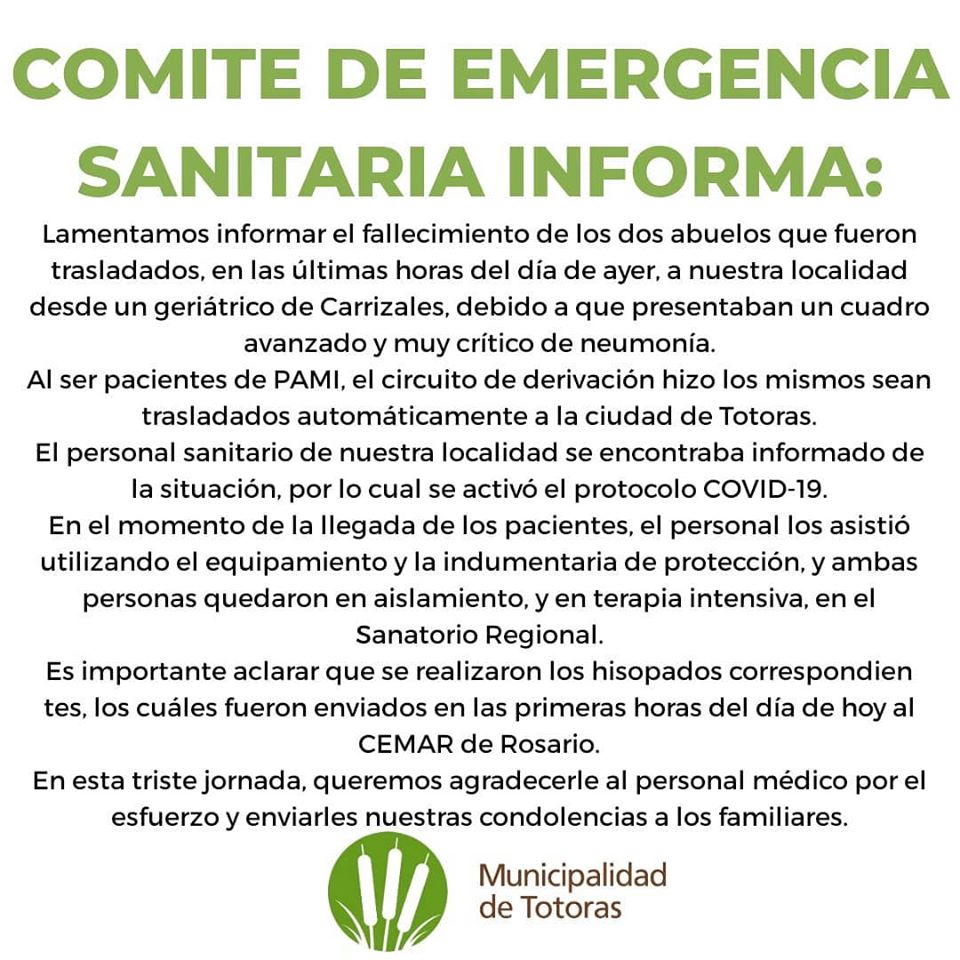 Ante esta situación, desde la Municipalidad de Totoras informaron que se activaron los protocolos sanitarios correspondientes a sospechas de casos de coronavirus: realizaron hisopados para destacar o confirmar que haya sido la enfermedad catalogada como pandemia lo que ocasionó la muerte de ambos ancianos.