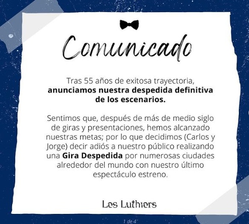 Tras 55 años de exitosa trayectoria, el conjunto humorístico-musical Les Luthiers anunció su despedida definitiva de los escenarios con la gira de «Más tropiezos de Mastropiero», el espectáculo que se estrenará el próximo 12 de enero en el Teatro Ópera de Buenos Aires.