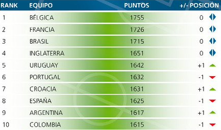 Con su empate 2-2 ante Alemania en el estadio del Borussia Dortmund y la goleada 6-1 sobre Ecuador en Elche, España, el conjunto que dirige Lionel Scaloni alcanzó los 1617 y superó a Colombia que quedó décimo con 1615. El podio no se modificó con Bélgica (1755), Francia (1726) y Brasil (1715). Uruguay desbancó a Portugal y escaló de la sexta a la quinta colocación.