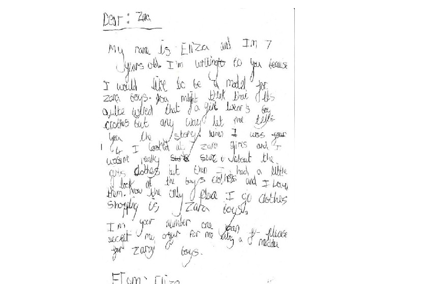 “Querido Zara, Me llamo Eliza y tengo siete años. Te escribo porque me gustaría ser modelo de Zara Boys. Podrás pensar que es un poco raro que una niña lleve ropa de niño, pero permíteme contarte la historia. Cuando tenía cuatro años eché un vistazo en Zara Girls pero no me convenció la ropa; luego hice lo mismo en la sección de chicos y me encantó. Ahora, sólo voy a comprar ropa allí. Soy tu fan número uno, por favor, acepta mi oferta para ser vuestra modelo en la sección Zara Boys”, expresa Eliza.