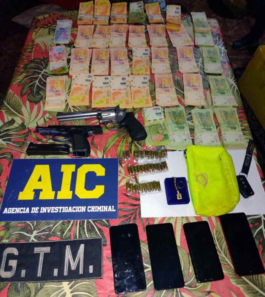 En la propiedad se incautaron cuatro celulares, la suma de 348.990 pesos, una llave de ignición de un Ford Focus, un revólver calibre 357, una pistola calibre 9 milímetros con cargador y doce municiones del mismo calibre; más 21 proyectiles calibre 9 milímetros.