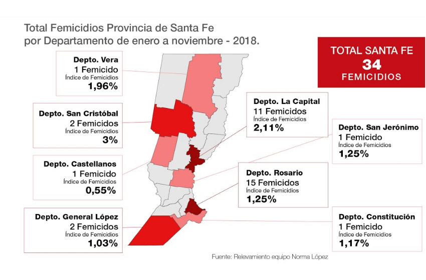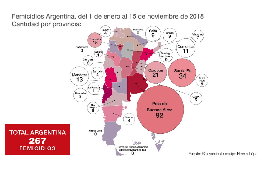 Según los datos que se desprenden del informe, del 1º de enero hasta el de 20 noviembre de 2018, en la Argentina se cometieron un total de 267 femicidios, siendo la provincia de Buenos Aires quien más casos presentó con 92, seguido de Santa Fe con 34 y Córdoba con 21.