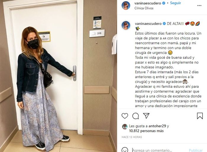 Pasados varios días, Vanina recibió el alta hace unas horas y compartió su alegría desde sus redes sociales. Allí, con una foto que le muestra en la puerta de la habitación de la clínica aseguró «Estos últimos días fueron una locura. Un viaje de placer con los chicos para reencontrarme con mamá, papá y mi hermana y terminó con una doble cirugía de urgencia. Toda mi vida gocé de buena salud y pasar por esto es algo que simplemente no me hubiese imaginado».