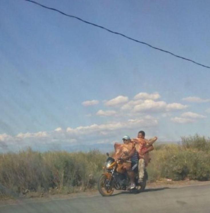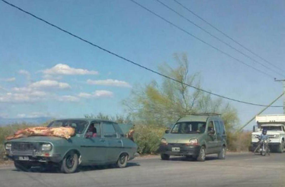 Un Fiat 600 con media res en el techo, un Renault 12 con carne apoyada en el parabrisas y hasta una motocicleta que intentaba transportar dos patas de vaca. Esas fueron algunas de las escenas que se vieron el miércoles pasado en la ruta 155, de San Juan, después que un camión de un frigorífico volcó.