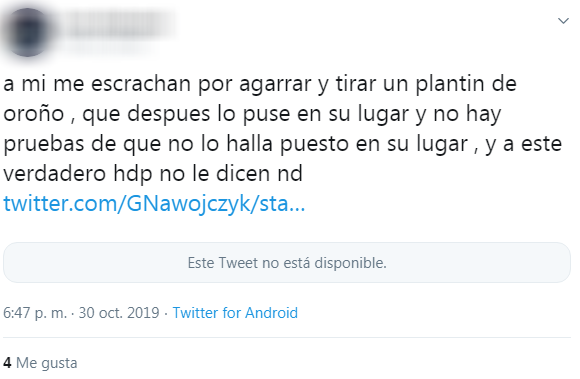 «Qué necesidad de armar quilombo al pedo. ¿Por qué no dejan de meterse en la vida de los demás?», escribió el presunto protagonista de los hechos vandálicos. Y agregó: «A mí me escrachan por agarrar y tirar un plantín de Oroño. Después lo puse en su lugar y no hay pruebas de que no lo haya puesto en su lugar».